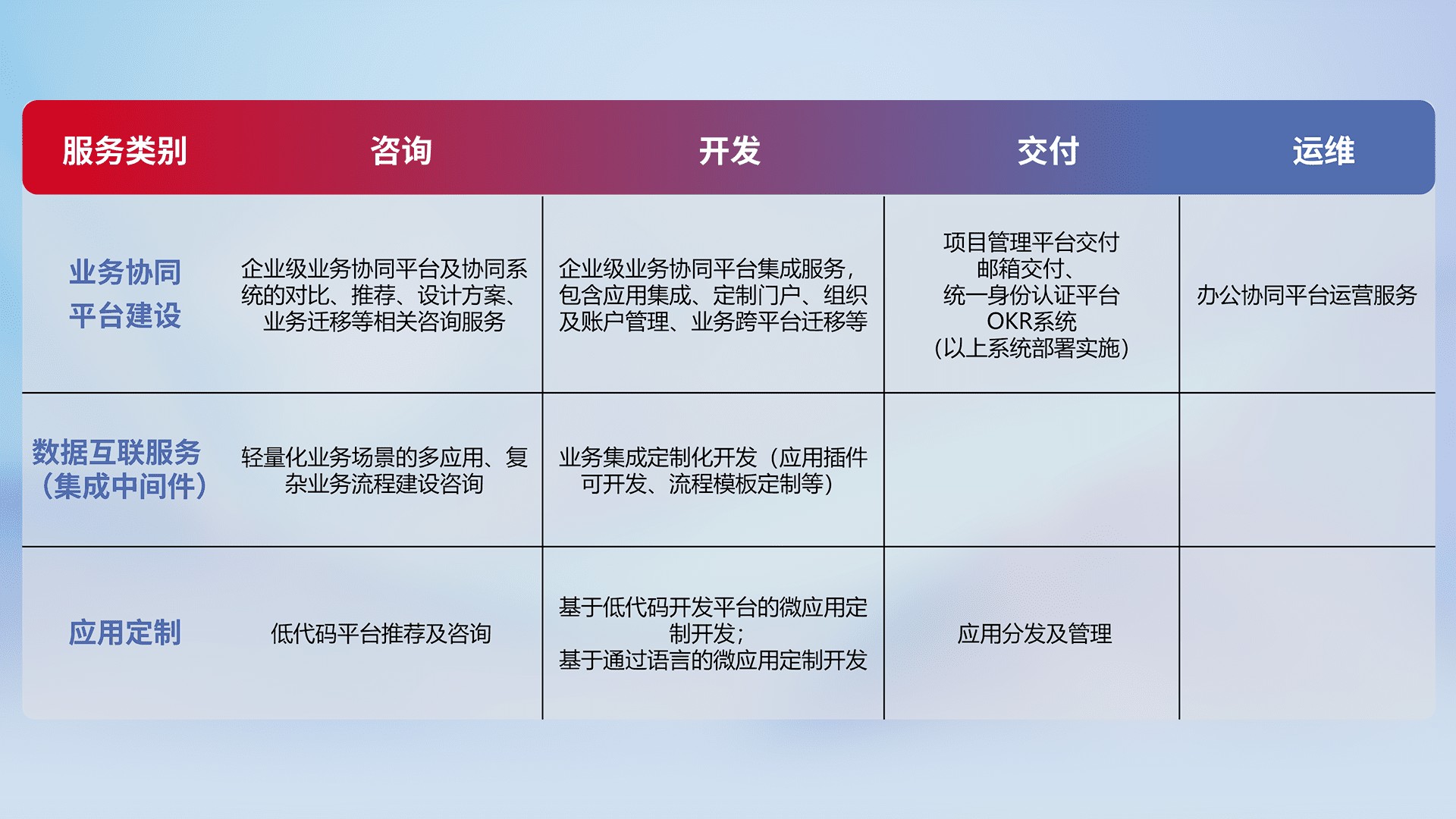 针对钉钉、、、、企微、、IDaas等平台级产品提供产品的规划、、、、方案、、、、交付、、定制化开发等服务,,,,实现如统一协同办公、、、智能客户服务、、、混合会议管理、、、、智能数据查询、、、、等业务场景,,,实现数字化转型。。。