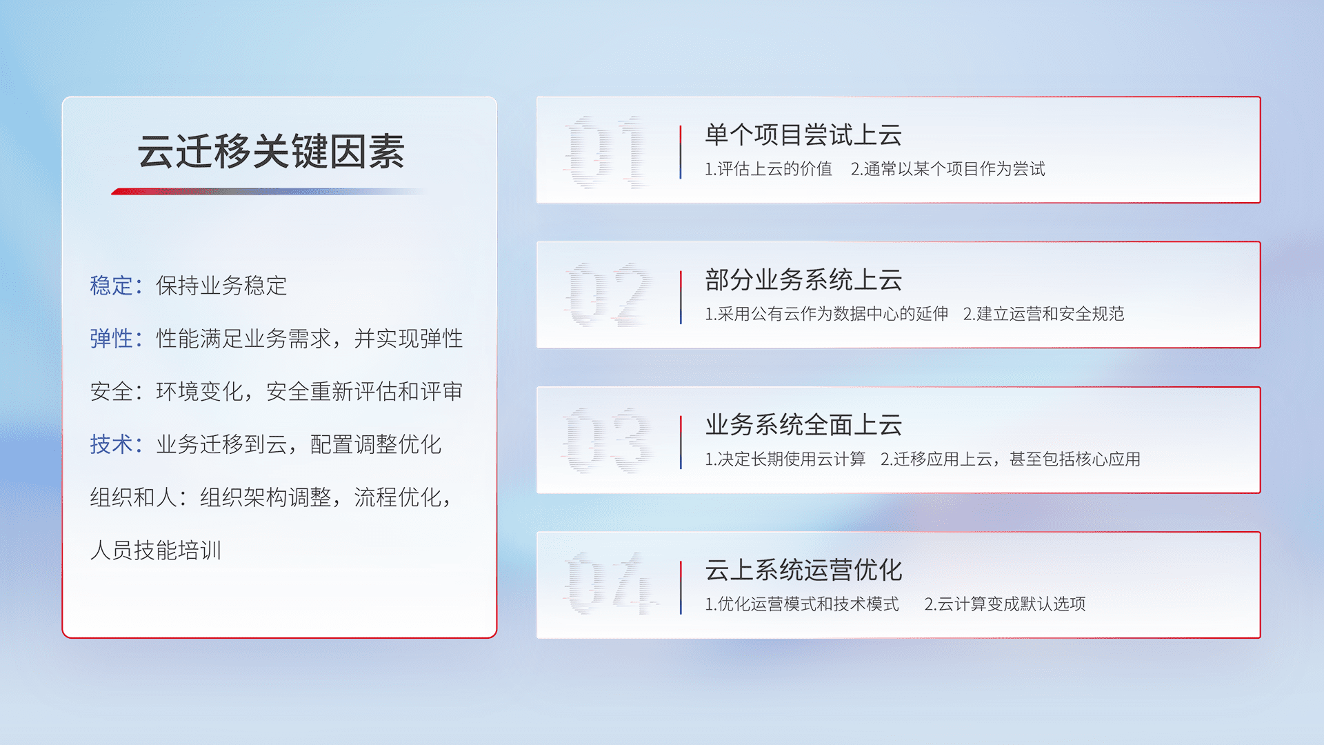 结合实际业务,,,从规划设计、、云平台选型、、云原生改造、、、、数据迁移、、、、集成交付,,,迁移全过程为客户识别最佳上云路径,,,做好风险识别管理,,设计网络架构、、、、身份权限、、安全审计合规、、操作审计、、日志审计、、、、监控告警策略、、、、多站点容灾设计等,,对云上基础设施进行整体规划,,,提升IT治理水平,,以满足弹性、、、、高可用、、、高性能的需求。。。。