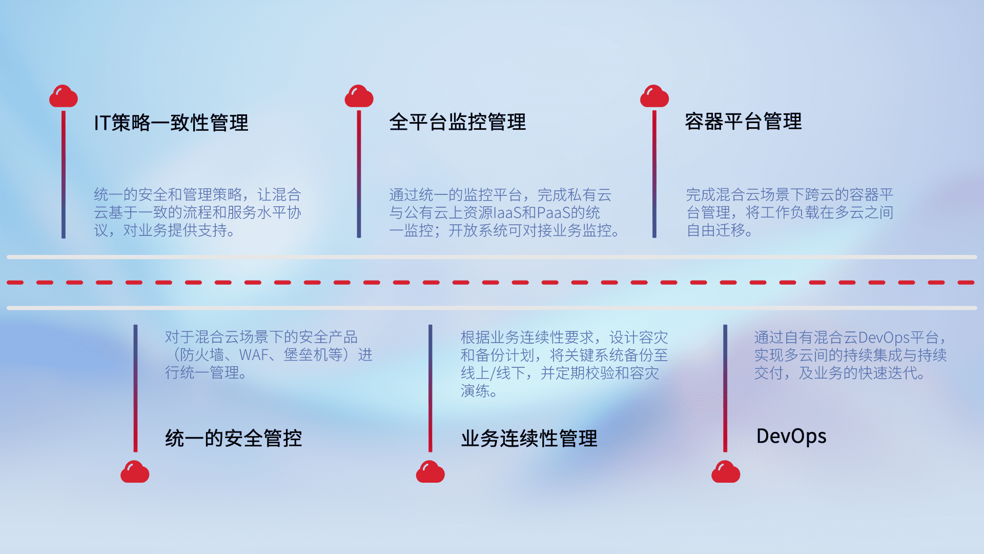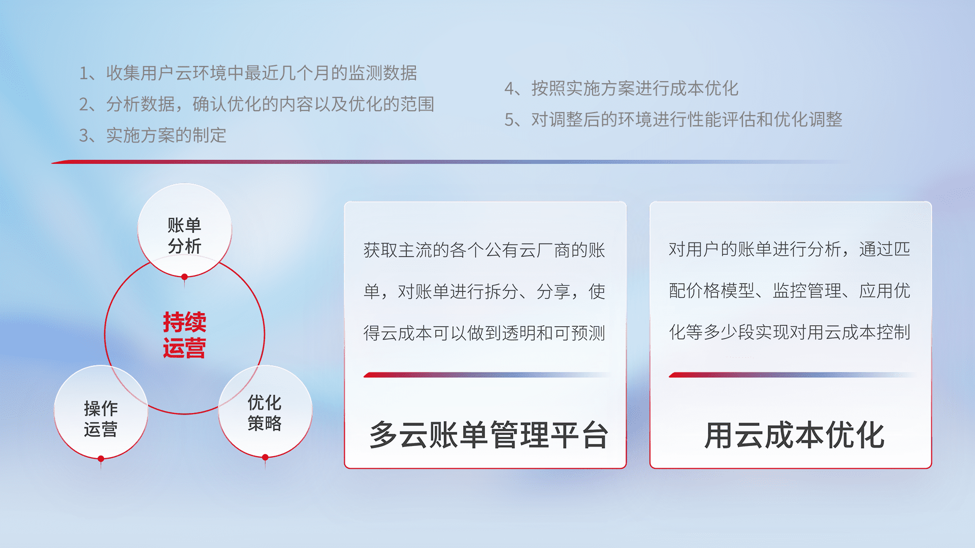 通过多云纳管,,,以统一的资源数据模型把客户的云资源进行抽象和封装,,进而实现对多云资源的统一操作,,,保障云资源管理的可靠性、、、稳定性与可用性。。。。量身定制化运维内容,,,,配置、、开发运维、、、、补丁管理、、备份、、、、监控、、认证和访问管理、、、审计和日常巡检等,,保障在用云过程中的可靠度,,稳定度以及高可用率。。。