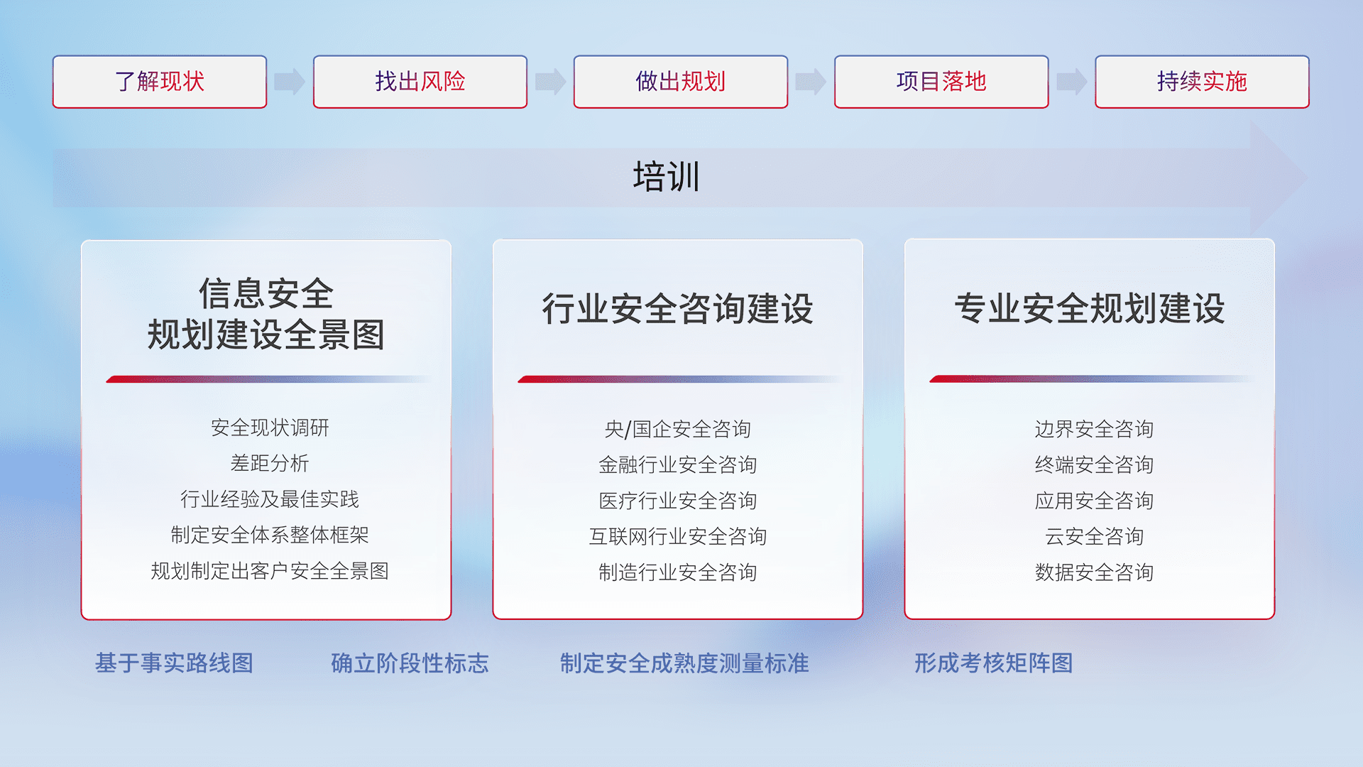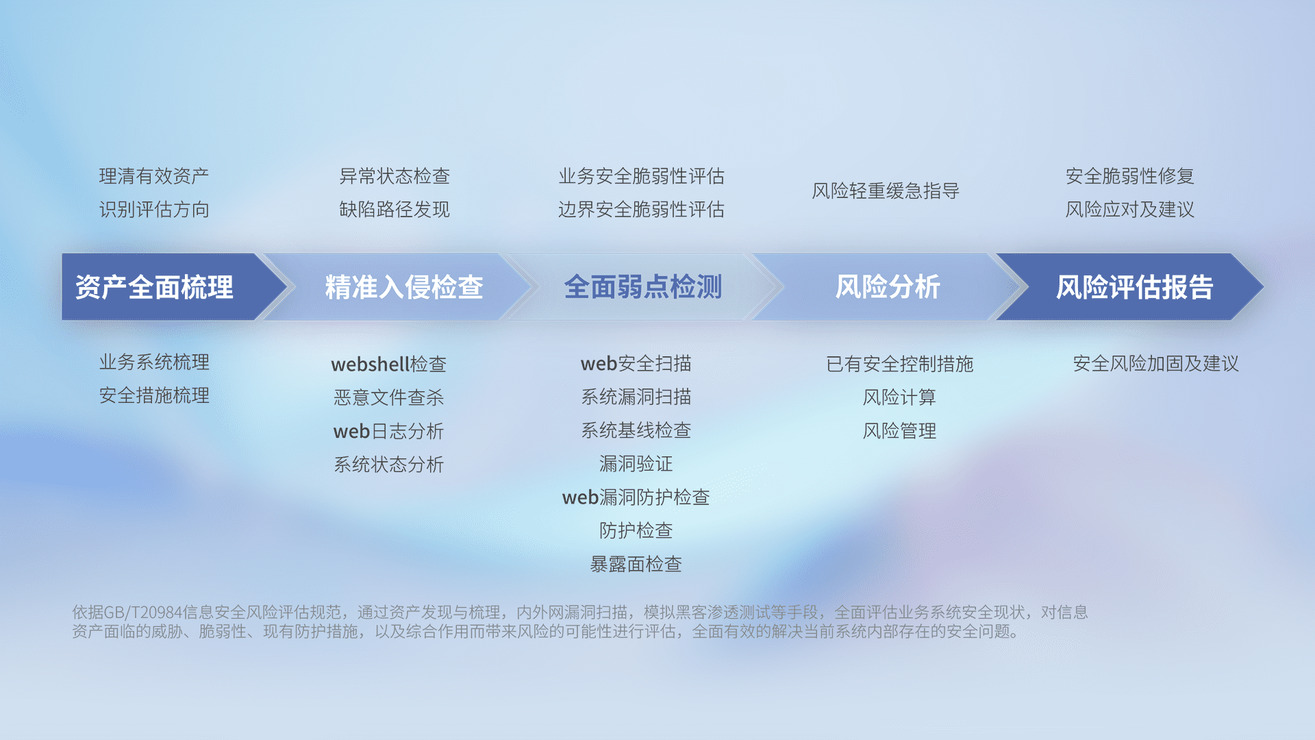 针对客户行业特性,,以专业的安全服务+多厂商联合解决方案提供专属的一站式安全管理服务,,,,帮助客户全面感知网络空间威胁,,基于识别、、、检测、、分析、、防护、、监测、、、、响应的服务理论模型,,从方案咨询、、集成交付、、、评估验证、、优化加固、、运维运营,,,致力于为客户提供完整的闭环管理式安全服务。。。。以实战经验为客户打造高抵御风险的安全体系,,,帮助客户发现威胁、、对抗威胁、、、、处置威胁,,,,不断积累安全对抗能力,,,,持续保障数字化安全。。